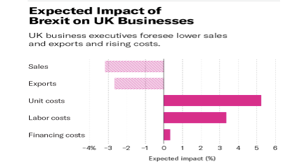 Brexit is essentially a political and economic shock and was largely unexpected. There are many unknown factors that are difficult for businesses to quantify (Bloom et al., 2019). The impact of Brexit on British businesses will be a daunting one. According to World Finance, the automotive, airline, pharmaceutical and financial services industries are likely to suffer the most (Worldfinance, 2019). Businesses expect Brexit to affect their sales, exports and costs. On average, businesses expect Brexit to eventually reduce their sales by around 3%. The effects on exports were also expected to be negative, while unit costs, labor costs, and financing costs were expected to increase (Bloom et al., 2019).