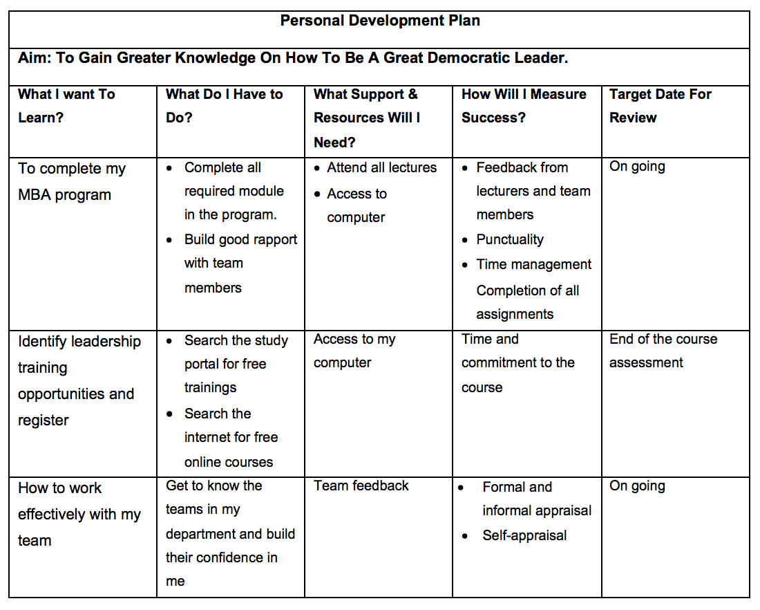 To be a good leader, the qualities and credentials needed are good education, ideas and power. As an MBA student, I have the primal qualification of good education from Coventry University London. I am still at the learning stage, I don’t know it all to effectively function as a good leader but just as John Maxwell said ‘ Leadership is Influence- nothing more, nothing less’. I am determined to influence my team positively in every way possible. For me to influence those around me, I need to grow my sense of self-responsibility, trust and self-confidence. Therefore, applying all the theories I have learnt in this module will help me design the future I need to be an effective and great leader. Below is my personal development plan that will help me achieve my aim to be an effective leader in the future.